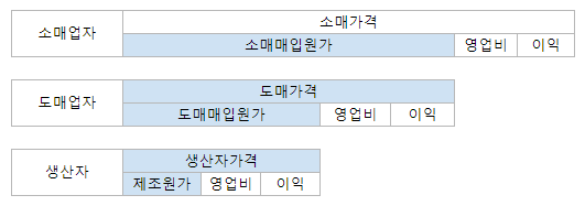 - 소매가격 : 소매매입원가(도매가격) + 소매업자영업비 + 소매업자이익