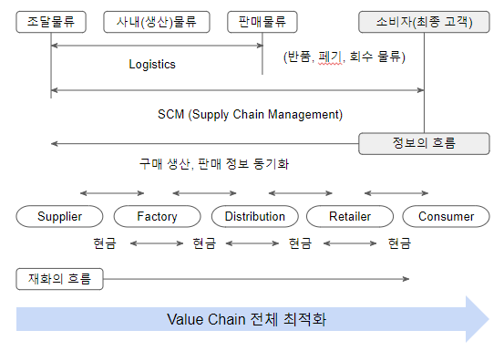 - 원자재와 부품의 공급업체에서 생산 공장에 납품되어 생산 과정을 거친 후 물류와 유통을 거쳐 고객에 이르는 모든 제품, 서비스와 관련되는 모든 흐름과 활동
