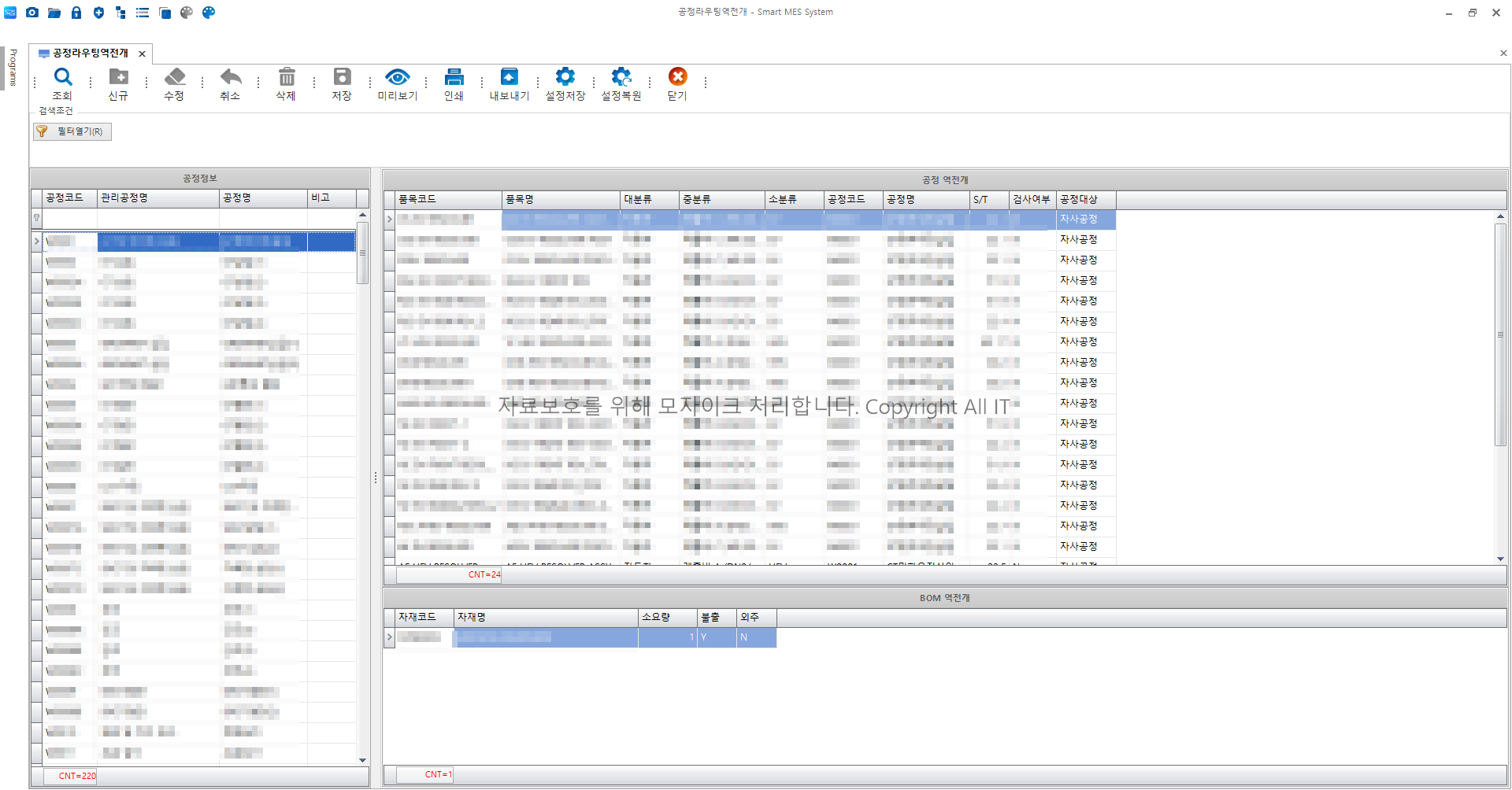 - 공정코드관리에 등록된 공정 코드를 기준으로 데이터를 역전개 표시한다.