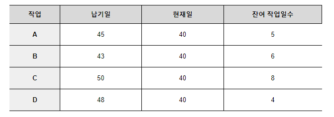 $$D의 긴급률(CR) = {납기일-현재일\over잔여 작업일수} = {48-40\over8} = {8\over4} = 2$$