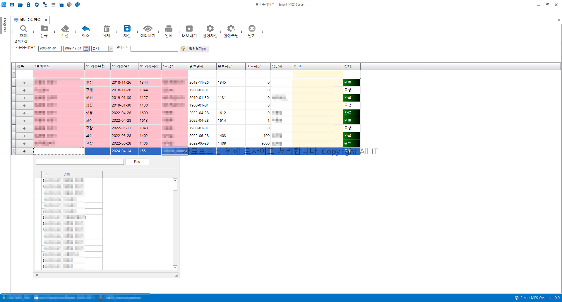 생산에 사용되는 설비의 수리 이력을 등록하여 관리한다.