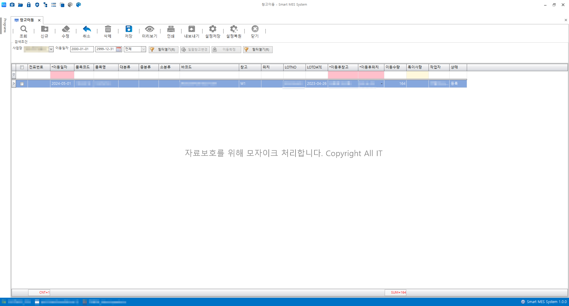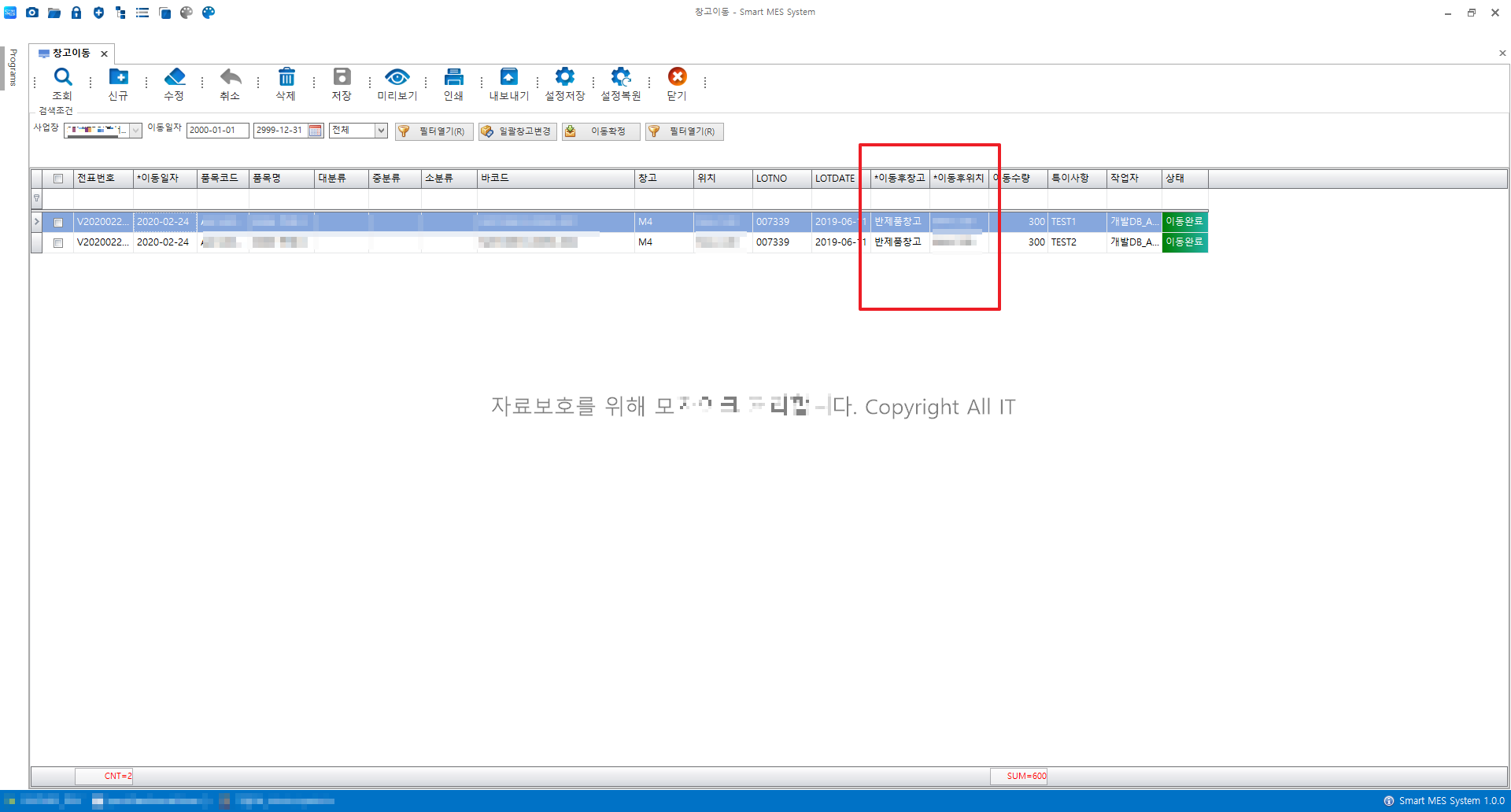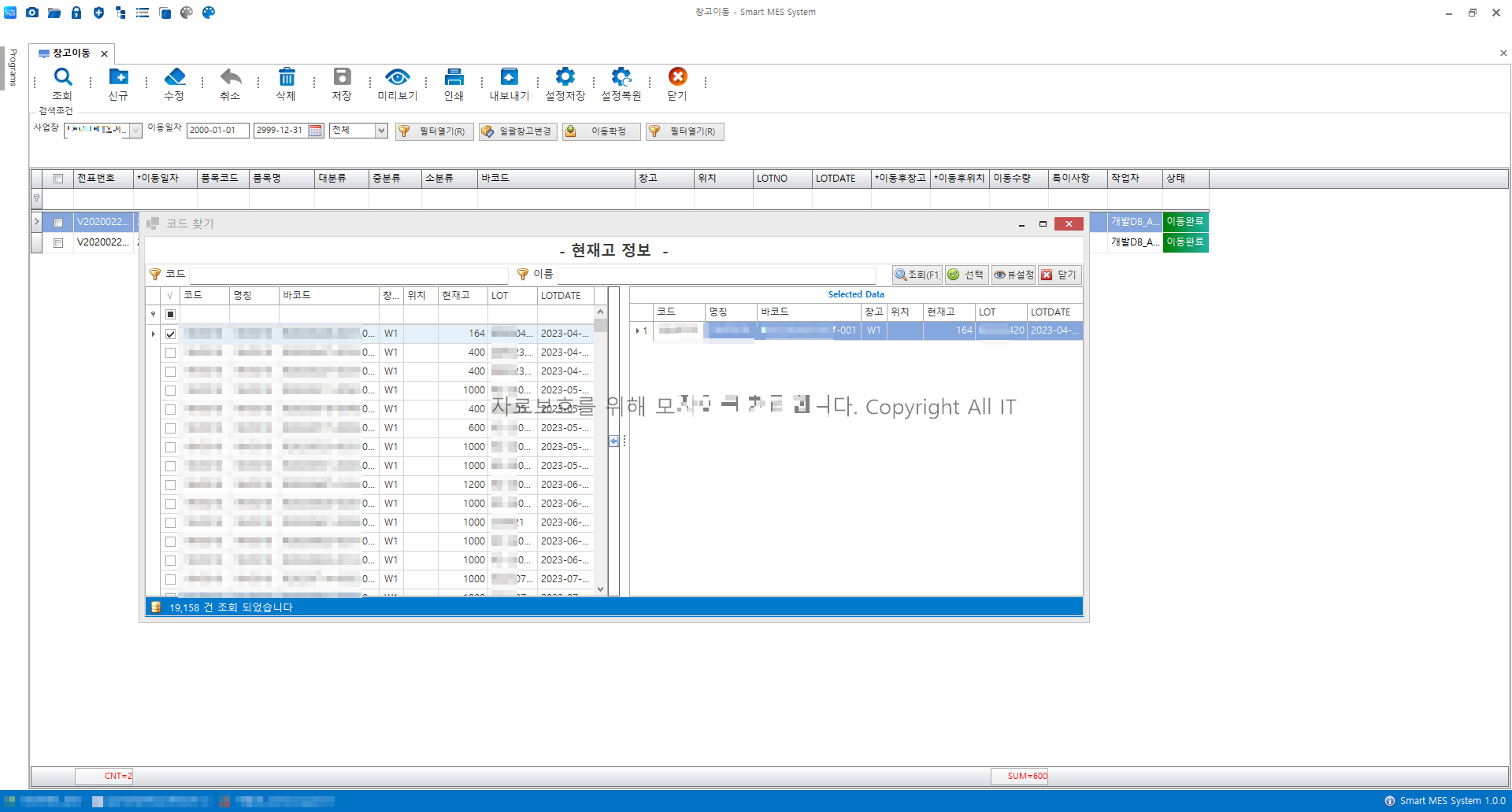 창고 간 재고이동 조회화면