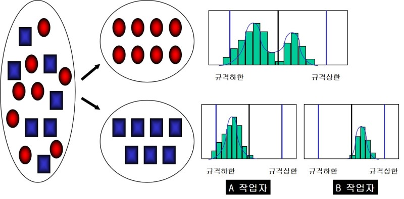 - 불량이나 고장 발생 시 기계별, 작업자별, 재료별, 시간별 등의 요인을 분류하여 몇 개의 층으로 나누어 불량 원인을 파악하기 위한 도표