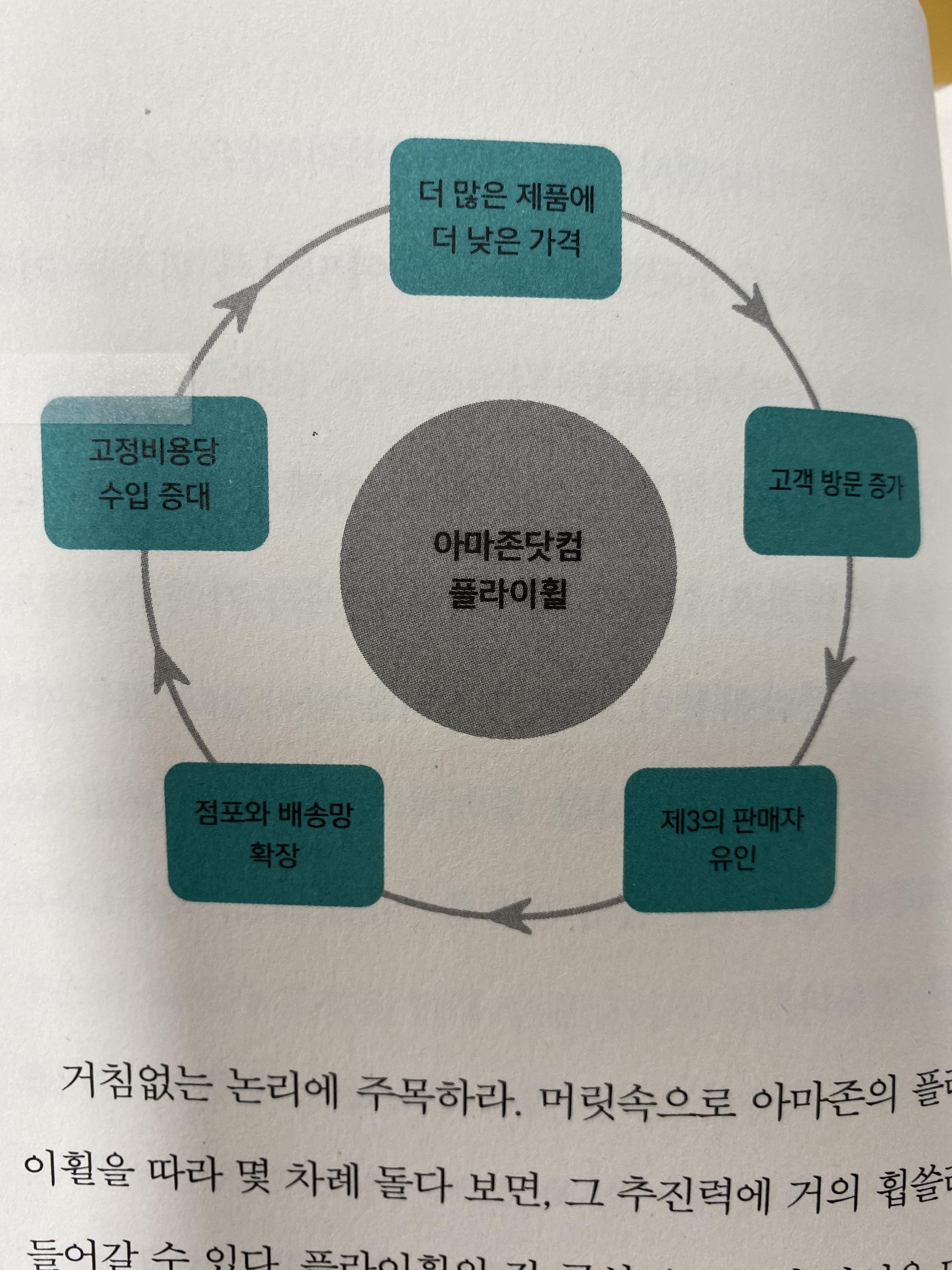 '더 낮은 가격이 더 많은 고객의 방문을 유도한다. 더 많은 고객이 판매량을 늘리고, 수수료를 내는 제3의 판매자를 사이트로 더 많이 유인한다. 그럼으로써 아마존은 물류 포장센터나 웹사이트 운영 서버와 같은 고정비용의 압박을 덜 수 있게 된다. 효율이 높아지면서 회사는 가격을 더 낮출 수 있게 된다.'