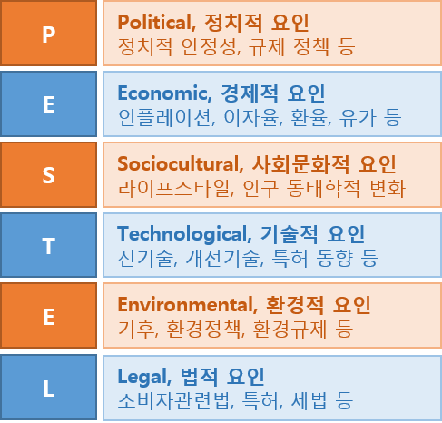 거시환경 분석을 위해 6가지 측면을 고려하여 분석한다. 정치, 경제, 사회, 기술, 환경, 법의 앞 글자를 따 PESTEL이라 부른다.