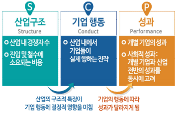 SCP 모형은 Structure(구조), Conduct(행동), Performance(성과)의 앞 단어를 붙인 용어이다. 산업구조에 따라 기업의 행동이 정해지며 그에 따라 성과가 창출된다는 단순하면서 명확한 이론으로 대체적으로 변화가 작은 산업군에 잘 맞는 모형이다. 외부의 충격에 따라 산업의 수익성 변동이 심한 산업군에서 더욱 강력한 분석 모델이다.
